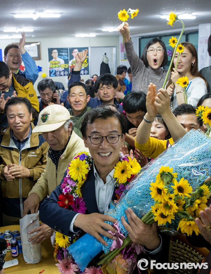 (부산=포커스뉴스) 전재수 더불어민주당 부산 북구강서구갑 후보가 13일 오후 부산 북구 선거사무소에서 당선이 확실시되자 지지자들과 함께 기쁨을 나누고 있다.