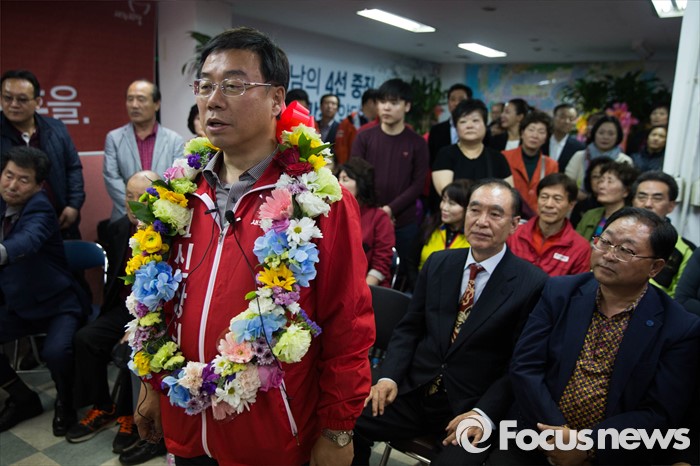 (성남=포커스뉴스) 제20대 국회의원 선거날인 13일 오후 경기도 성남 중원구에 위치한 선거사무실에서 신상진 새누리당 후보가 '당선확실' 이라는 방송사 개표 상황을 확인하고 취재진과 인터뷰를 하고 있다.