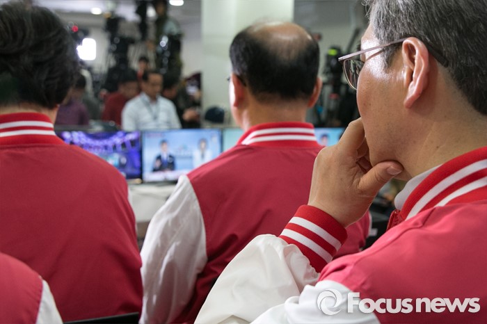 (서울=포커스뉴스) 제20대 국회의원 선거날인 13일 오후 서울 여의도 새누리당사에서 비례대표 후보들과 당직자들이 심각한 표정으로 개표방송을 시청하고 있다.
