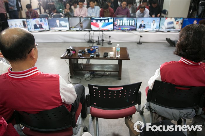 (서울=포커스뉴스) 제20대 국회의원 선거날인 13일 오후 서울 여의도 새누리당사에서 비례대표 후보들과 당직자들이 개표방송 시청 중, 자리를 떠나고 있다.