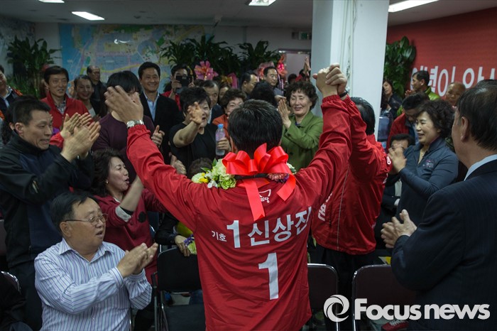 (성남=포커스뉴스) 제20대 국회의원 선거날인 13일 오후 경기도 성남 중원구에 위치한 선거사무실에서 신상진 새누리당 후보가 '당선확실' 이라는 방송사 개표 상황을 확인하고 지지자들의 축하를 받고 있다.