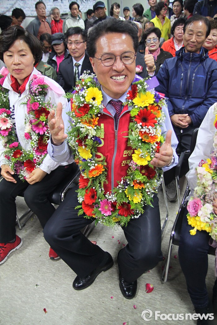 (서울=포커스뉴스) 제20대 국회의원선거일인 13일 정운천 새누리당 전주시을 후보가 당선이 확실시 되자 자신의 사무소에서 세리머니를 하고 있다. <사진제공= 정운천 후보 선거사무소>