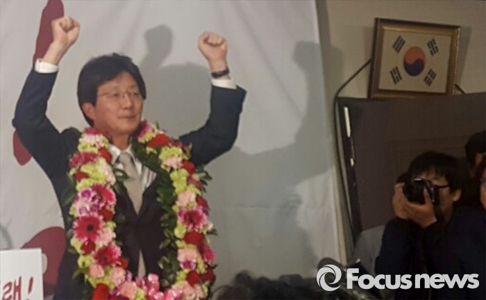 (대구=포커스뉴스) 제20대 국회의원선거 대구 동구을 선거구에서 당선된 무소속 유승민 후보가 13일 오후 대구 동구 선거사무소에서 꽃목걸이를 걸고 주먹을 불끈 쥐고 있다.