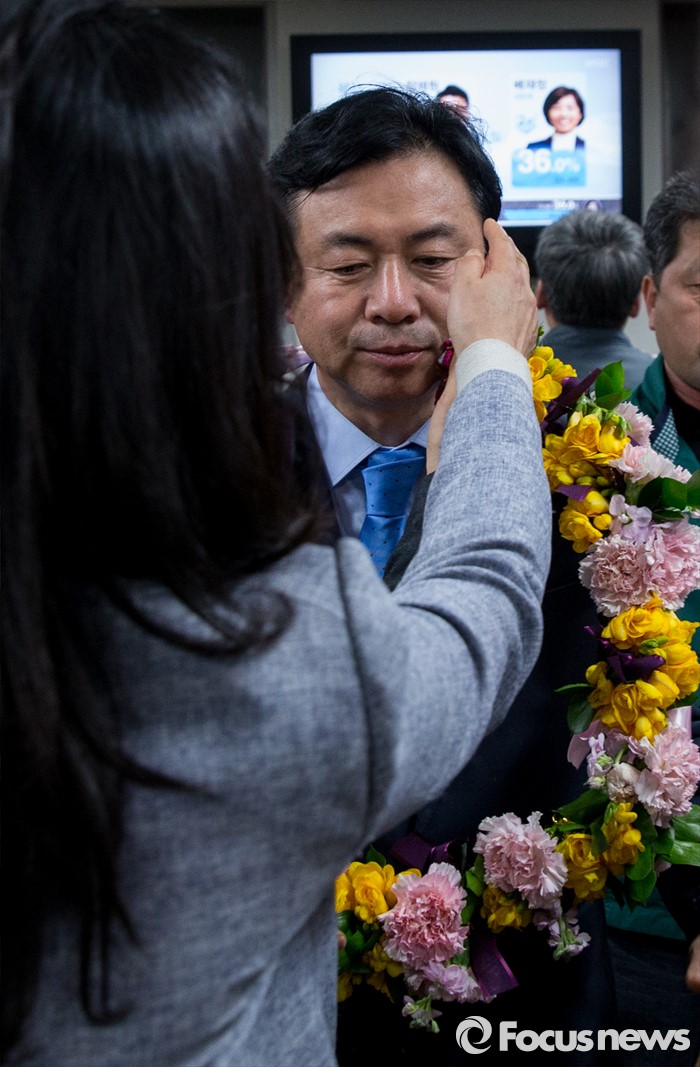 (부산=포커스뉴스) 제20대 국회의원선거에서 당선이 확실시된 전재수 더불어민주당 부산 진구갑 후보가 13일 오후 부산 진구 선거사무소에서매무새를 단정히 하고 있다.