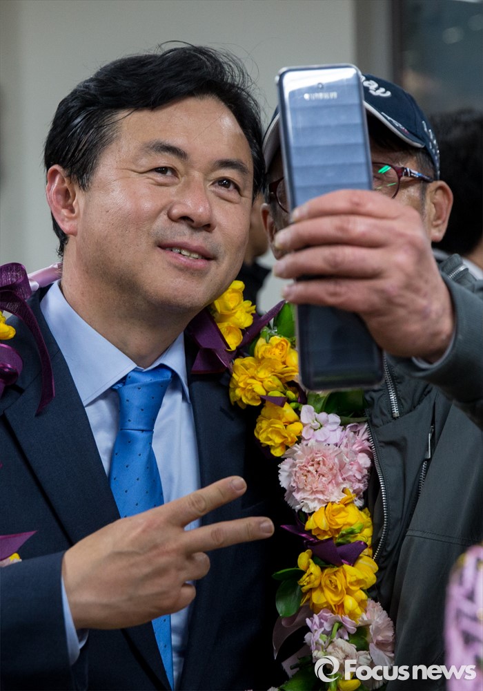 (부산=포커스뉴스) 제20대 국회의원선거에서 당선이 확실시된 전재수 더불어민주당 부산 진구갑 후보가 13일 오후 부산 진구 선거사무소에서 지지자들과 함께 기념사진을 찍고 있다.