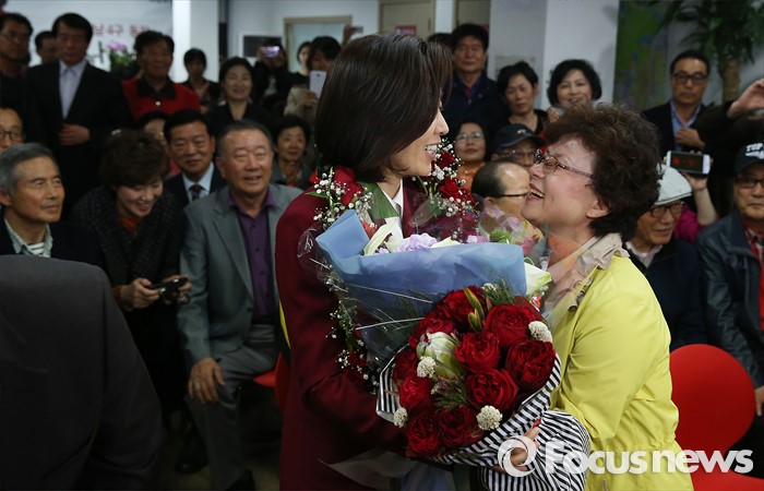 (서울=포커스뉴스) 제20대 국회의원 선거날인 13일 오후 서울 동작구에 위치한 선거사무실에서 나경원 새누리당 동작구을 후보가 지지자에게 꽃다발을 받고 있다.