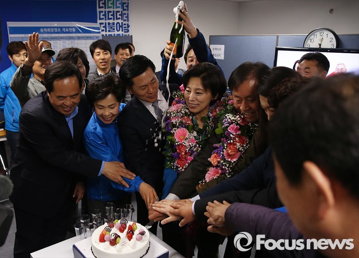 (서울=포커스뉴스) 14일 오전 서울 송파구에 위치한 선거사무실에서 남인순 더불어민주당 송파구병 후보가 지지자들에게 축하를 받고 있다.