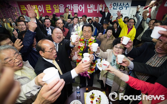 (인천=포커스뉴스) 제20대 국회의원선거 인천 중구동구강화군옹진군 선거구에서 당선이 확실시 된 안상수 무소속 후보가 13일 오후 인천 중구 선거사무소에서 지지자들과 축배를 들고 있다.