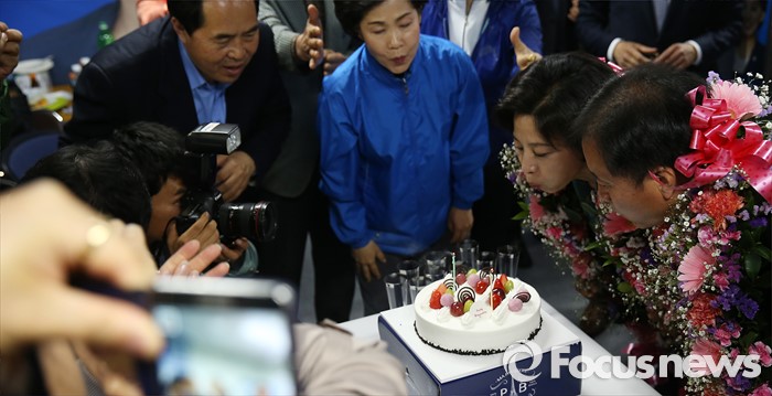 (서울=포커스뉴스) 14일 오전 서울 송파구에 위치한 선거사무실에서 남인순 더불어민주당 송파구병 후보가 축하 케이크의 촛불을 끄고 있다.