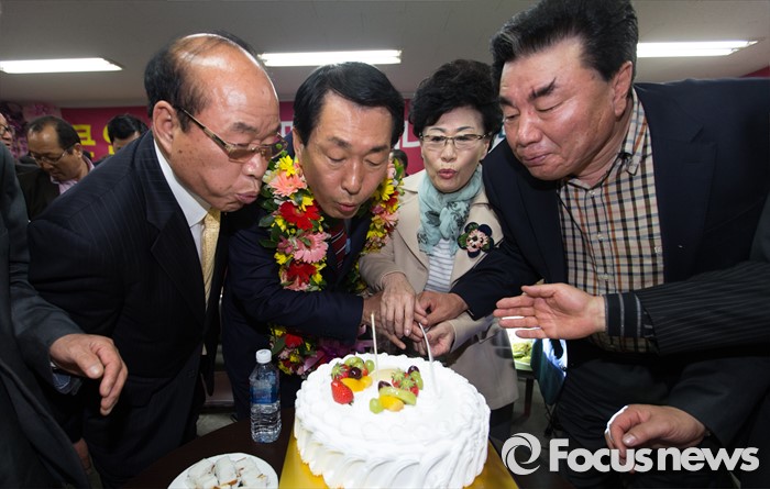 (인천=포커스뉴스) 제20대 국회의원선거 인천 중구동구강화군옹진군 선거구에서 당선이 확실시 된 안상수 무소속 후보가 13일 오후 인천 중구 선거사무소에서 지지자들과 세레머니를 하고 있다.