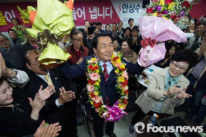(인천=포커스뉴스) 제20대 국회의원선거 인천 중구동구강화군옹진군 선거구에서 당선이 확실시 된 안상수 무소속 후보가 13일 오후 인천 중구 선거사무소에서 지지자들과 기쁨을 나누고 있다.
