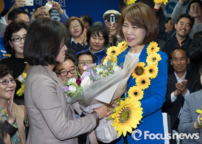 | △ 꽃목걸이 선물 받는 전현희 후보 |
