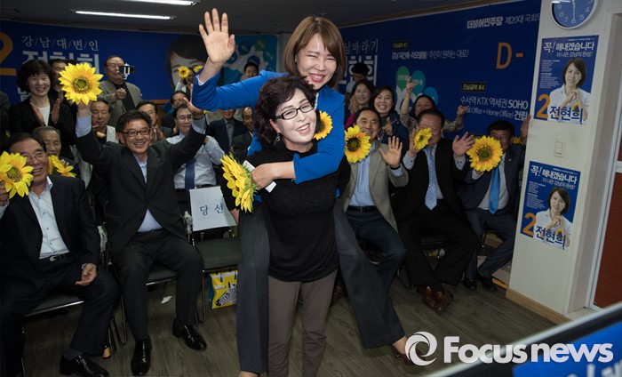 (서울=포커스뉴스) 2016 제20대 국회의원선거날인 13일 오후 서울 강남구 로즈데일빌딩에 위치한 전현희 더불어민주당 강남을 후보 선거사무소에서 전 후보가 당선이 유력해지자 지지자들과 기뻐하고 있다.