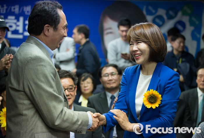 (서울=포커스뉴스) 2016 제20대 국회의원선거날인 13일 오후 서울 강남구 로즈데일빌딩에 위치한 전현희 더불어민주당 강남을 후보 선거사무소에서 전 후보가 지지자들과 인사를 나누고 있다.