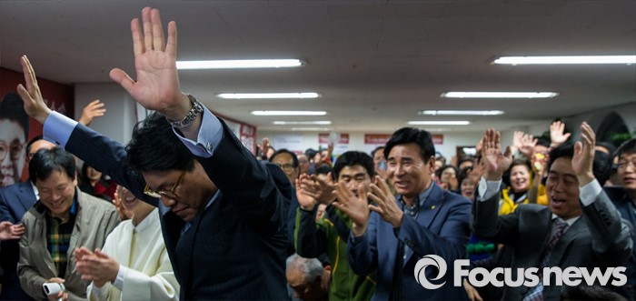 (부산=포커스뉴스) 제20대 국회의원선거에서 당선이 확실시된 장제원 무소속 부산 사상구 후보가 14일 오전 부산 사상구 선거사무소에서 두 손을 들어 기뻐하고 있다.