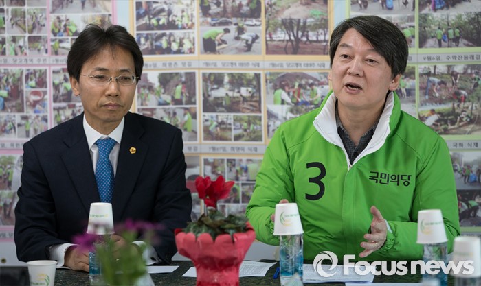 2위는 42.4%를 차지한 더불어민주당 김윤덕 후보가 차지했다.(서울=포커스뉴스) 안철수 국민의당 상임공동대표(오른쪽)와 김광수 서울시의원이 22일 오후 서울 노원구 상계동 김광수 서울시의원 사무실에서 지역상공인들과 대화의 시간을 갖고 있다. 2016.03.22 김흥구 기자
