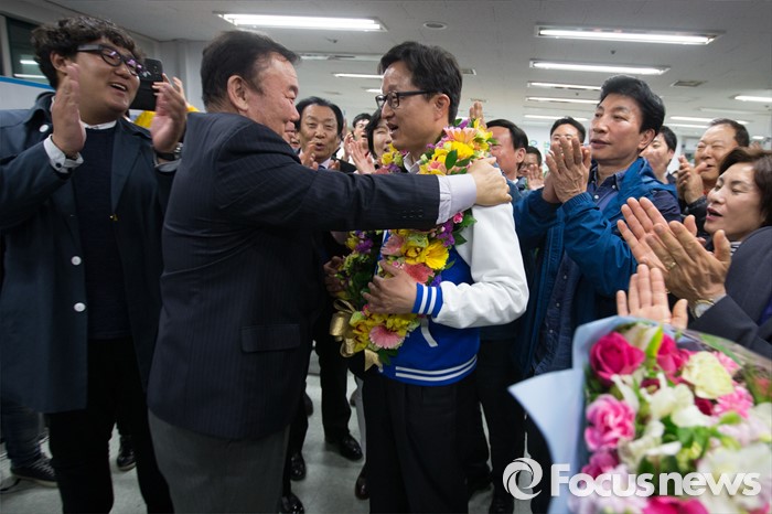 (서울=포커스뉴스) 강병원 더불어민주당 은평을 후보가 14일 오전 서울 은평구 선거사무소에서 당선이 유력시되자 지지자들과 함께 기쁨을 나누고 있다.