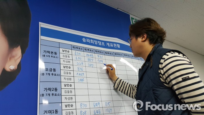 (서울=포커스뉴스) "가락본동 제5투표소, 김을동 666, 남인순 834!" "와!!!!"