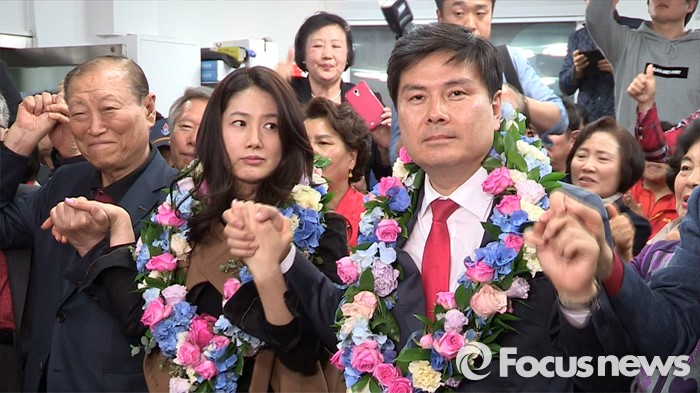 (서울=포커스뉴스) 20대 총선에서 당선이 확정된 지상욱 새누리당 중구성동을 후보가 14일 중구 신당동 선거사무소에서 부인 심은하 씨와 함께 기뻐하고 있다. <사진=포커스뉴스 영상캡쳐>
