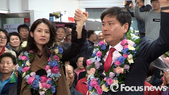 (서울=포커스뉴스) 20대 총선에서 당선이 확정된 지상욱 새누리당 중구성동을 후보가 14일 중구 신당동 선거사무소에서 부인 심은하 씨와 함께 기뻐하고 있다. <사진=포커스뉴스 영상캡쳐>