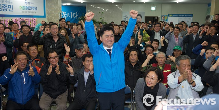 (논산=포커스뉴스) 제20대 충남 논산계룡금산 국회의원에 당선된 김종민 더불어민주당 당선인이 14일 논산 선거사무실에서 환호하고 있다.