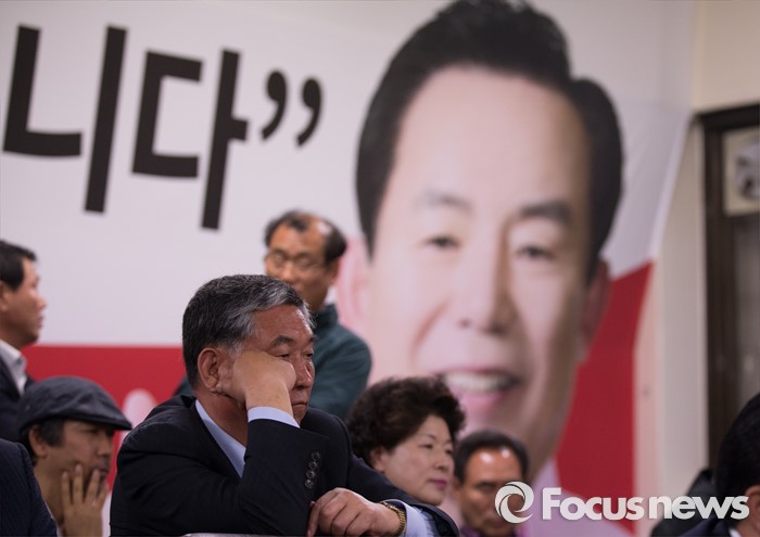 (논산=포커스뉴스) 14일 제20대 충남 논산계룡금산 국회의원 선거에서 낙선한 이인제 새누리당 후보 선거사무소에서 지지자들이 경직된 모습으로 개표결과를 지켜보고 있다.