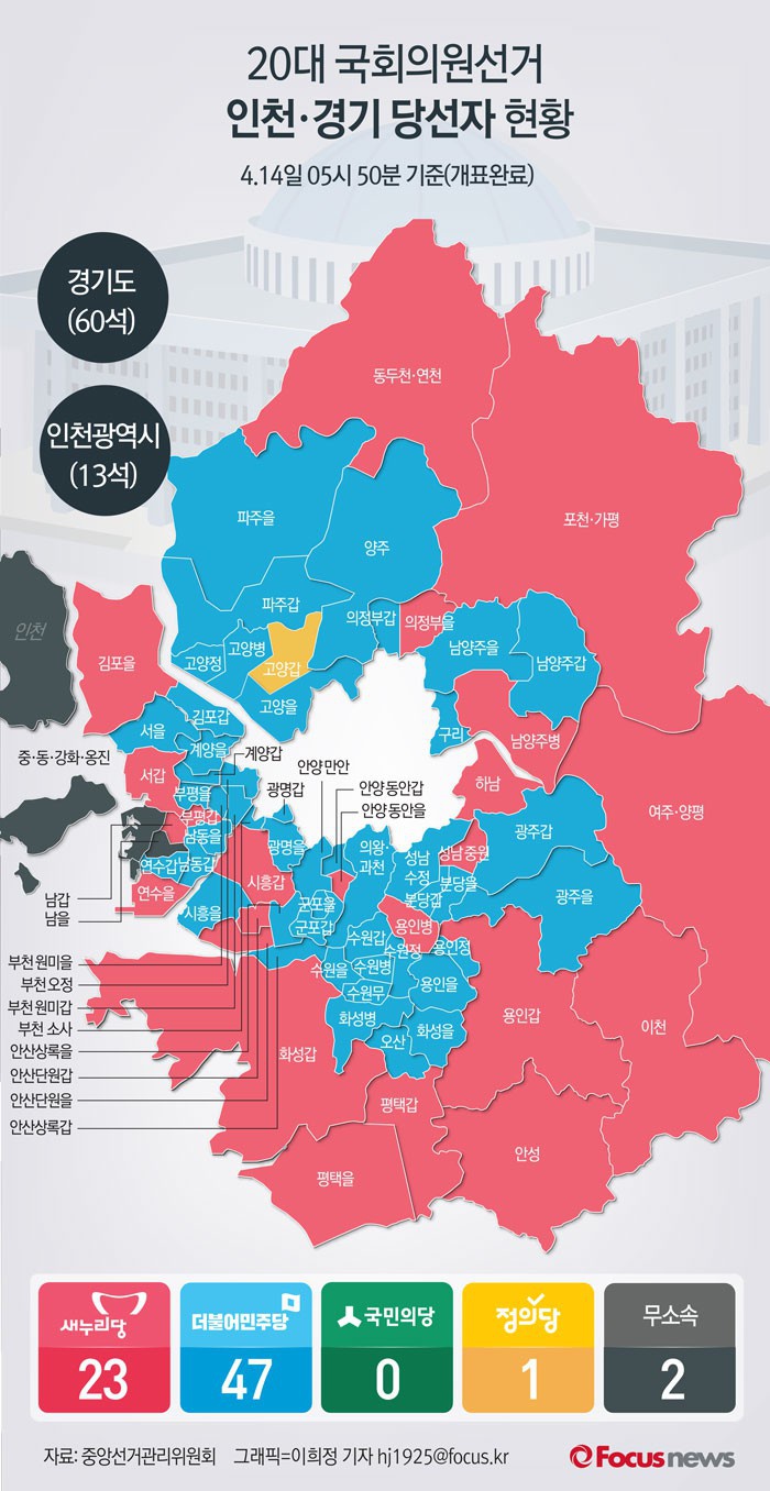(서울=포커스뉴스) 20대 국회의원선거 개표결과 경기·인천지역에서 새누리당은 23석, 더불어민주당이 47석, 정의당 1석, 무소속은 2석을 차지했다.