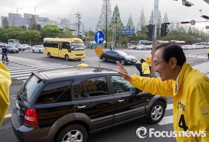 (창원=포커스뉴스) 제20대 국회의원선거 경남 창원 성산구 국회의원에 당선된 노회찬 정의당 당선인이 14일 오전 창원시 위아사거리에서 출근길 시민들에게 당선인사를 하고 있다.