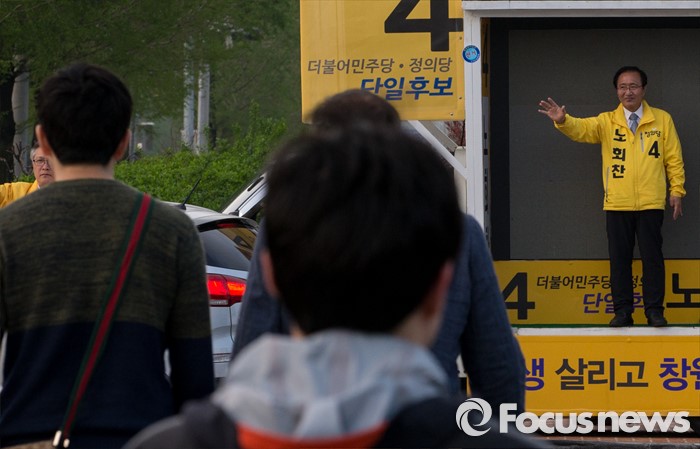 (창원=포커스뉴스) 제20대 국회의원선거 경남 창원 성산구 국회의원에 당선된 노회찬 정의당 당선인이 14일 오전 창원시 위아사거리에서 출근길 시민들에게 당선인사를 하고 있다.