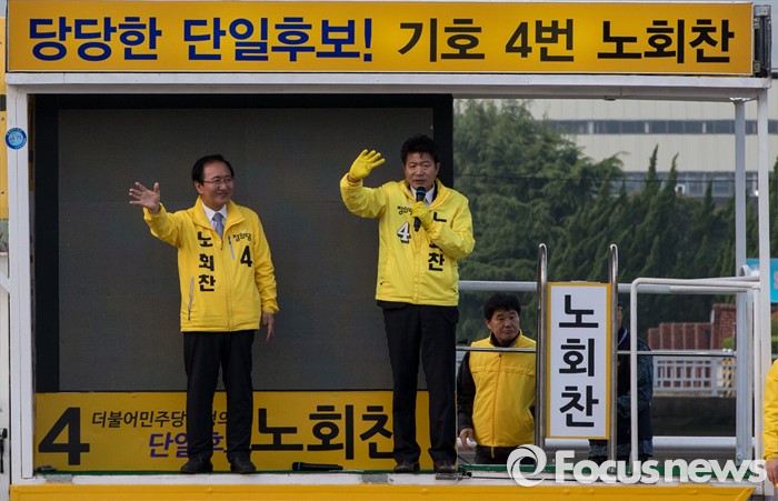 (창원=포커스뉴스) 제20대 국회의원선거 경남 창원 성산구 국회의원에 당선된 노회찬 정의당 당선인이 14일 오전 창원시 위아사거리에서 출근길 시민들에게 당선인사를 하고 있다.