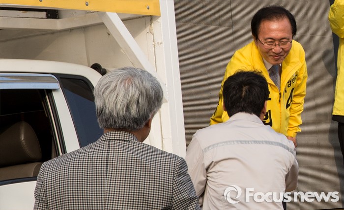 (창원=포커스뉴스) 제20대 국회의원선거 경남 창원 성산구 국회의원에 당선된 노회찬 정의당 당선인이 14일 오전 창원시 위아사거리에서 출근길 시민들에게 당선인사를 하고 있다.