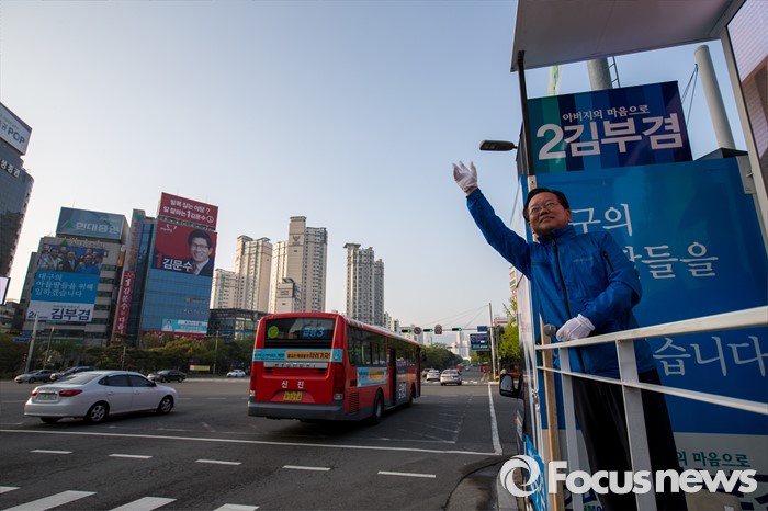 (대구=포커스뉴스) 제20대 국회의원선거 대구 수성구갑 선거구에서 당선된 더불어민주당 김부겸 당선자가 14일 오전 대구 수성구 범어네거리에서 당선 인사를 하고 있다.