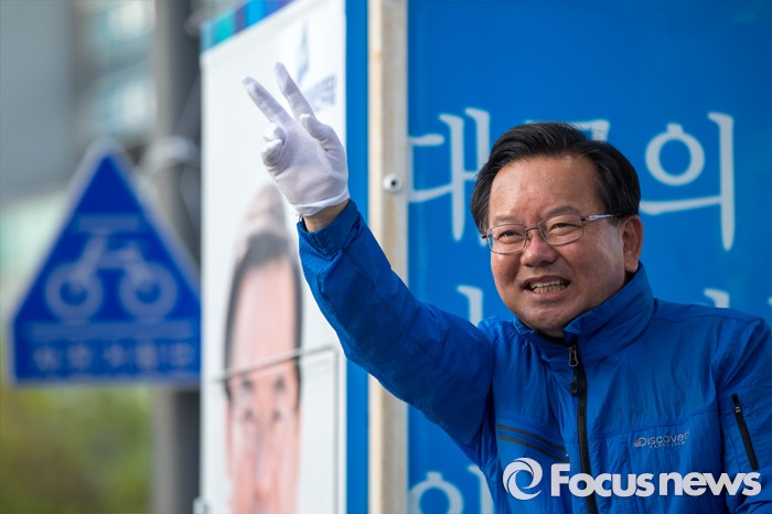 (대구=포커스뉴스) 제20대 국회의원선거 대구 수성구갑 선거구에서 당선된 더불어민주당 김부겸 당선자가 14일 오전 대구 수성구 범어네거리에서 당선 인사를 하고 있다.