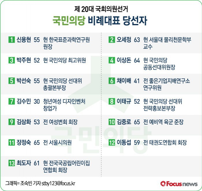 청년 몫의 7번에는 ‘허니버터칩’ 디자인으로 유명한 김수민(30·여) 청년여성 디자인벤처 창업가가, 이태규 국민의당 선거대책위원회 전략홍보본부장(53)은 비례대표 8번으로 당선됐다.
