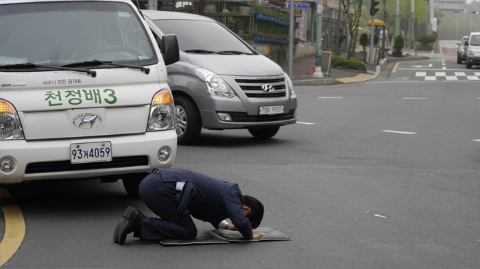 (광주=포커스뉴스) 14일 오전 광주 서구 풍암동 장미공원 사거리에서 제20대 국회의원 선거 광주 서구을에 당선된 천정배 국민의당 공동대표가 유권자들에게 감사를 표하며 큰절을 하고 있다. <사진제공=천정배 선거사무소>