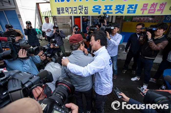(대구=포커스뉴스) 제20대 국회의원선거 대구 동구을 지역구에서 당선된 무소속 유승민 당선자가 14일 오전 대구 동구 불로시장에 도착해 주민들에게 당선인사 하고 있다.