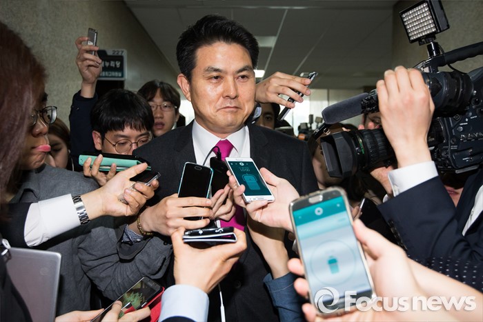 (서울=포커스뉴스) 20대 총선 패배에 책임을 지고 김무성 새누리당 대표가 당 대표직을 사퇴한 4일 오전 서울 여의도 국회에서 중앙선대위 해단식을 마친 김태호 최고위원이 취재진 질문에 답하고 있다.