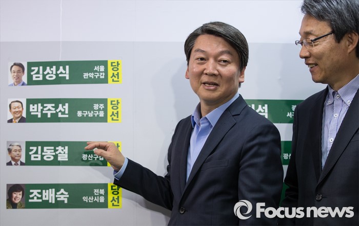 (서울=포커스뉴스) 안철수 국민의당 상임공동대표가 14일 오전 마포구 당사에서 선거 상황판에 당선된 후보들의 이름표를 붙이고 있다.