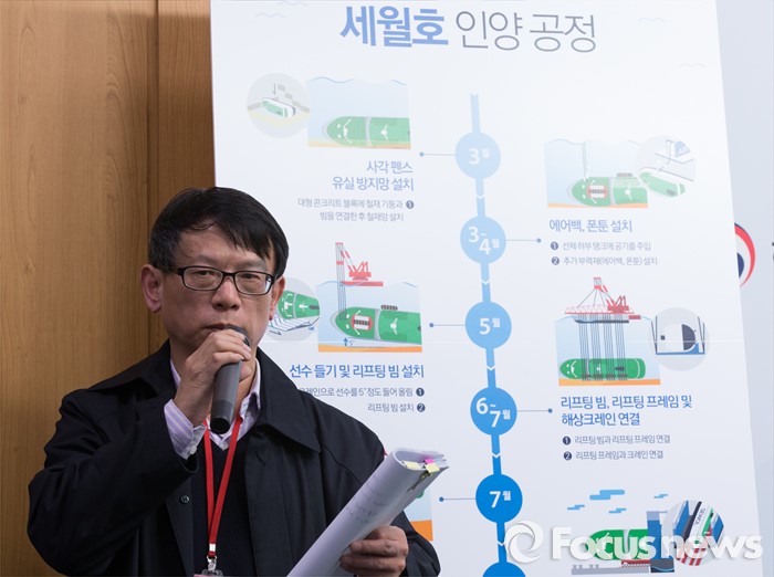 (세종=포커스뉴스) 왕웨이핑 세월호 인양 현장 총감독이 14일 오전 세종시 정부세종청사 해양수산부 기자실에서 세월호 인양 작업에 대해 설명하고 있다.