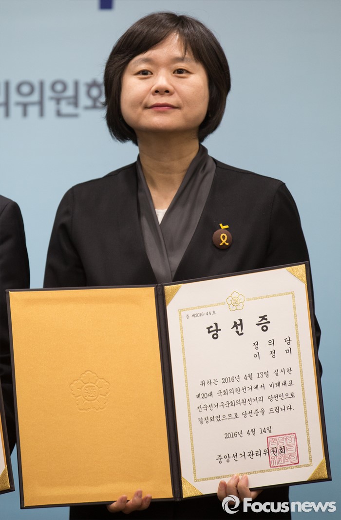 (과천=포커스뉴스) 14일 오후 경기도 과천 중앙선거관리위원회 회의실에서 열린 제20대 국회의원선거 비례대표국회의원 당선증 교부식에 참석한 이정미 정의당 당선인이 기념촬영 하고 있다.