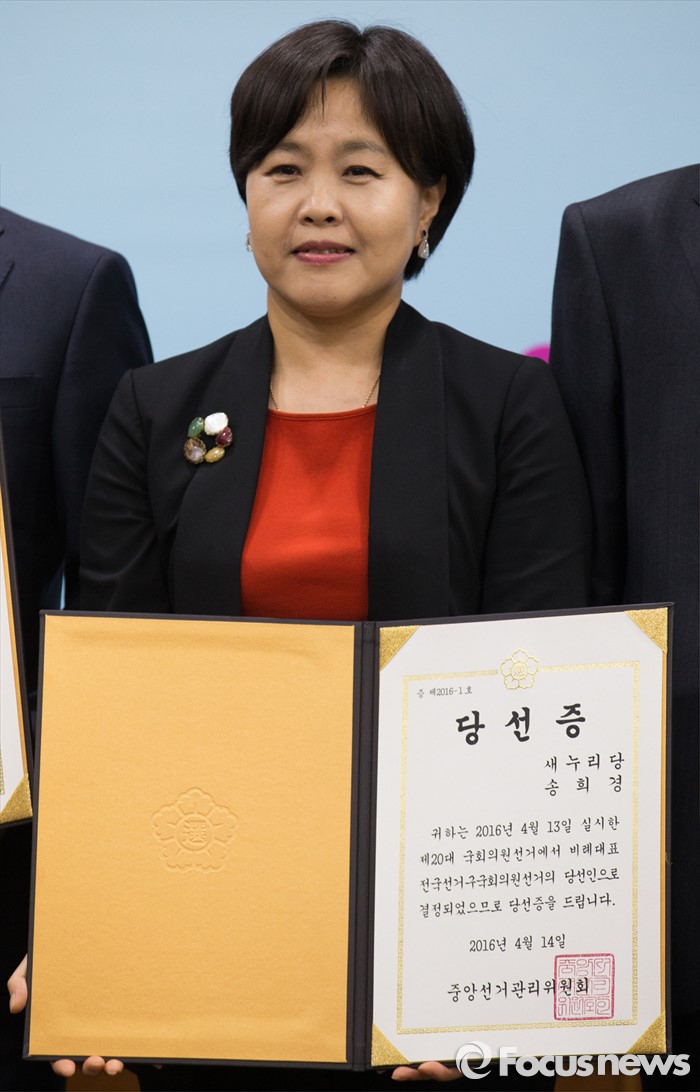 (과천=포커스뉴스) 14일 오후 경기도 과천 중앙선거관리위원회 회의실에서 열린 제20대 국회의원선거 비례대표국회의원 당선증 교부식에 참석한 송희경 새누리당 당선인이 기념촬영 하고 있다.