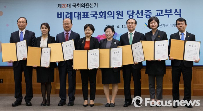 (과천=포커스뉴스) 14일 오후 경기도 과천 중앙선거관리위원회 회의실에서 열린 제20대 국회의원선거 비례대표국회의원 당선증 교부식에 참석한 당선자들이 기념촬영을 하고 있다. 왼쪽부터 더불어민주당 최운열, 박경미, 새누리당 이종명, 송희경, 국민의당 신용현, 오세정, 정의당 이정미, 김종대 당선인.