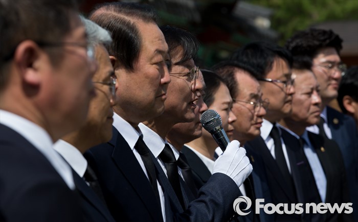 (광주=포커스뉴스) 14일 오후 광주 북구 국립5.18민주묘지에서 천정배 국민의당 공동대표를 비롯한 광주 지역 당선자들이 참배를 마치고 취재진 질문에 답하고 있다.