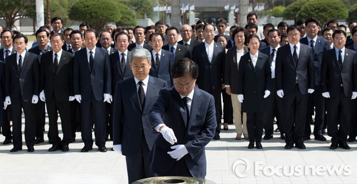 (광주=포커스뉴스) 14일 오후 광주 북구 국립5.18민주묘지에서 천정배 국민의당 공동대표가 분향을 하고 있다.