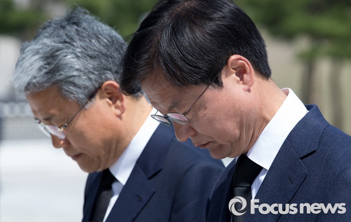(광주=포커스뉴스) 14일 오후 광주 북구 국립5.18민주묘지에서 천정배 국민의당 공동대표와 김동철 광산갑 당선인이 묵념을 하고 있다.