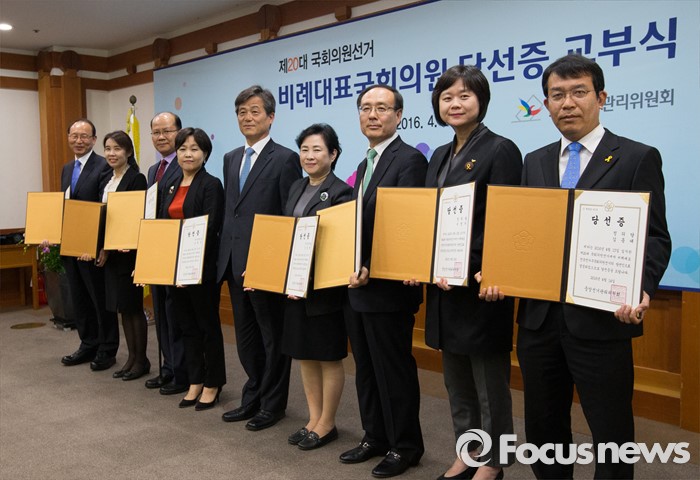 (과천=포커스뉴스) 14일 오후 경기도 과천 중앙선거관리위원회 회의실에서 열린 제20대 국회의원선거 비례대표국회의원 당선증 교부식에 참석한 이인복 중앙선거관리위원회 위원장과 당선인들이 기념촬영을 하고 있다. 왼쪽부터 더불어민주당 최운열, 박경미, 새누리당 이종명, 송희경 당선인, 이 위원장, 국민의당 신용현, 오세정, 정의당 이정미, 김종대 당선인.