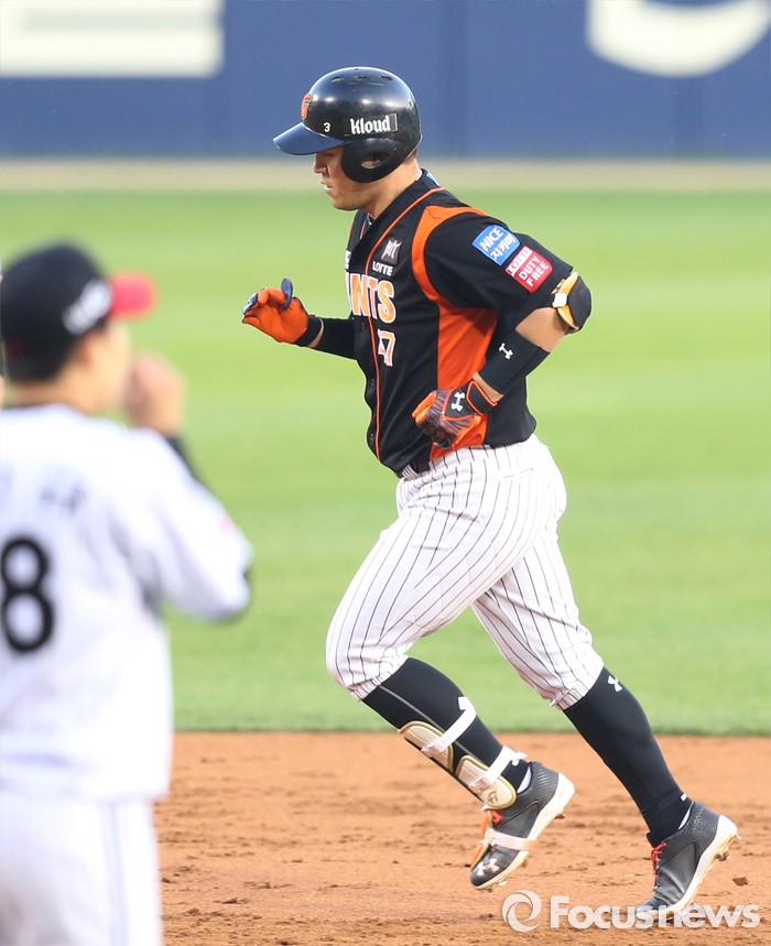 (서울=포커스뉴스) 14일 서울 잠실구장에서 열린 2016 프로야구 롯데-LG 경기 1회초 2사 1루에서 롯데 강민호가 좌월 2점 홈런을 치고 베이스를 돌고 있다.