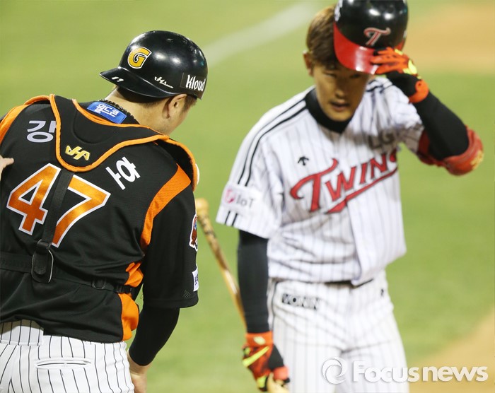 (서울=포커스뉴스) 14일 서울 잠실구장에서 열린 2016 프로야구 롯데-LG 경기 5회말 LG 정주현이 자신의 파울 타구를 어깨에 맞은 롯데 포수 강민호에게 인사를 하고 있다.