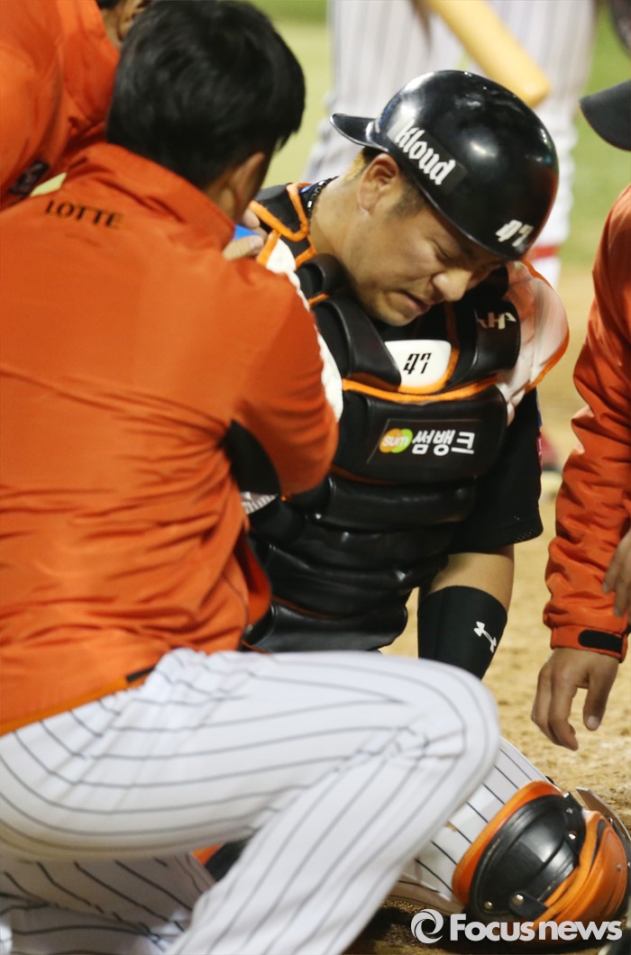 (서울=포커스뉴스) 14일 서울 잠실구장에서 열린 2016 프로야구 롯데-LG 경기 5회말 롯데 포수 강민호가 LG 정주현의 파울 타구를 어깨에 맞은후 트레이너의 치료를 받고 있다.