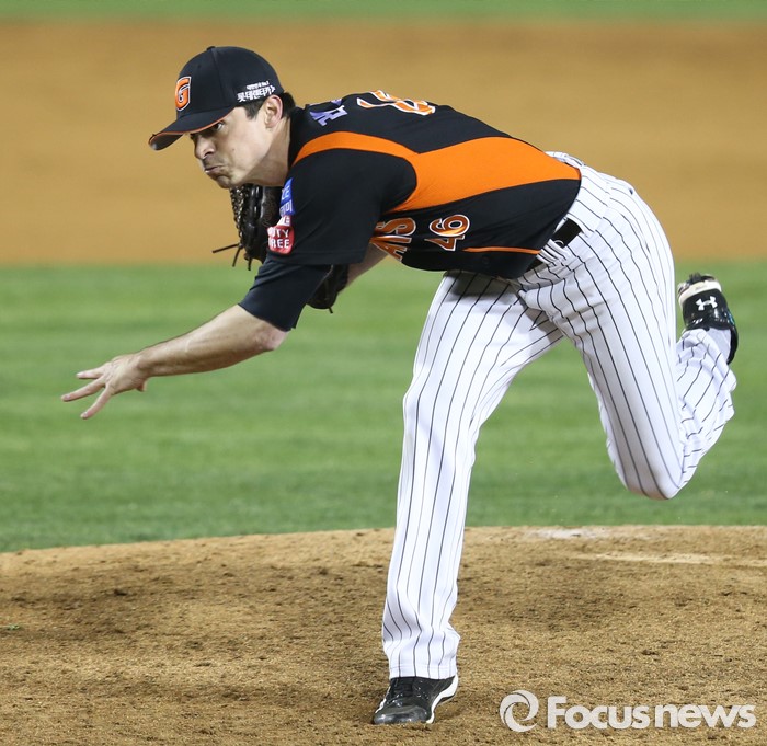 (서울=포커스뉴스) 14일 서울 잠실구장에서 열린 2016 프로야구 롯데-LG 경기에서 10탈삼진 무사사구 완봉승 따낸 롯데 투수 레일리가 9회말 투구하고 있다.